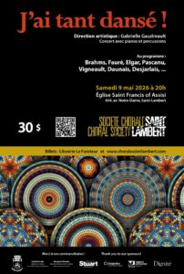 Premier choeur centenaire au Québec, la Société chorale de Saint-Lambert est un grand choeur classique mixte et bilingue, dirigé par une jeune cheffe très talentueuse, Gabrielle Gaudreault.